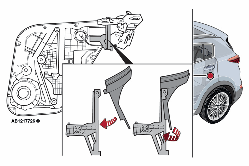 2. Odstranite notranjo oblogo zadnjih vrat. Preverite ali je prišlo do omenjene korozije priključka.. Po potrebi zamenjate mehanizem za zaklep zadnjih vrat. Z uporabo kompleta za popravilo namestite kanal za odtekanje vode na zadnje vodilo vrat. Postopek ponovite tudi na drugi strani. To bi moralo težavo odpraviti.